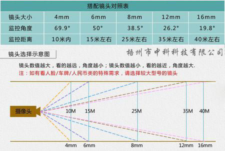2、監(jiān)控?cái)z像頭的鏡頭毫米數(shù)值越小,看的越近(有效范圍),但是攝像頭的有效角度就越大或?qū)?,角度大距離攝像頭近的東西也能很好的覆蓋,并且也能看清楚,反之看遠(yuǎn)了就不清晰。 所以一般店內(nèi)或超市,常用的都是4mm 6mm居多,特殊情況可以使用毫米數(shù)大的,這些都是視情況而定。