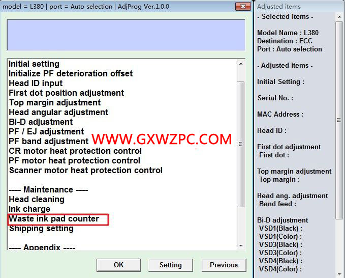 3. 選擇Waste ink pad counter(廢墨計數(shù)器)